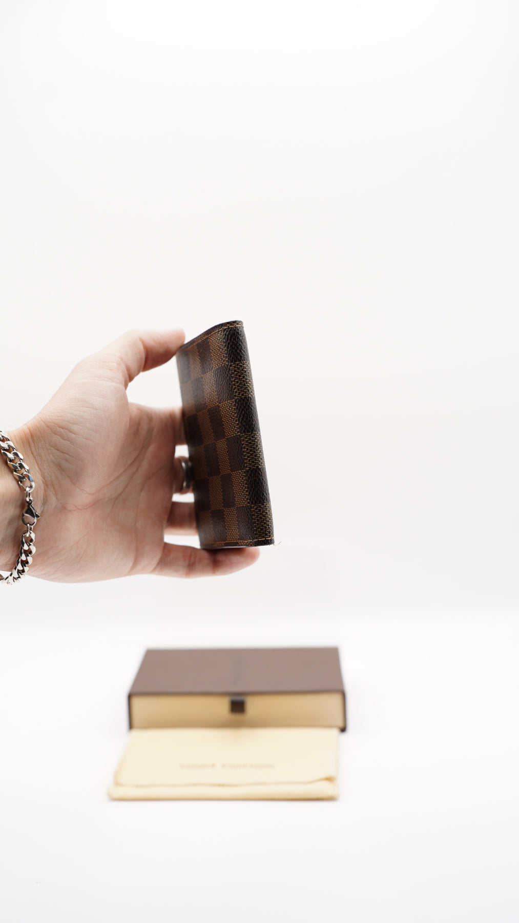 • Color / Material: Damier Ebene / Coated canvas with leather lining and gold-tone snap hardware